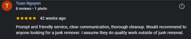 Awesome professional service with great communication. We had quit a few large items in the backyard and deck needs removal. Team showed up ready to work and they even clean the leaves off the deck without being asked (awesome surprise). They definitely have quality in mind while performing the work! Will call them again for other jobs, highly recommended!!